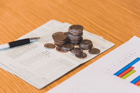 Saving stack coins money concept,graph,chart document and pen on desktop desk in hipster office,copy space.selective focus,vintage color