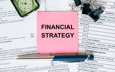 Text Financial Strategy on note paper with pen, compass and paper clips. Business and financial conzept