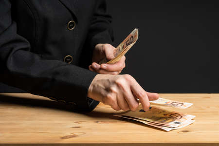 Woman hands counting money. Business woman holding fifty euro banknotes in hands. European finance currency.