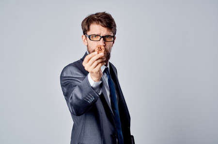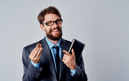 Businessman in a suit with a cryptocurrency in his hand Bitcoin coin documents currency rates