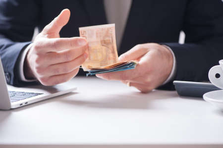 Persons hand counting cash money paper currency payment. Financial operations with cash money, easy and dirty money. Financial Crisis Eu Bill. Concept - Finance Business Investment Success