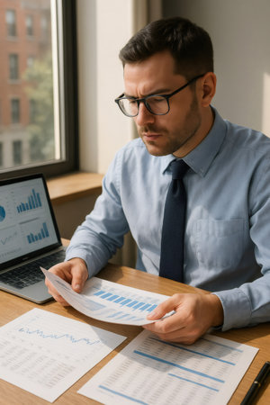 Professional man wearing a shirt and tie reviewing business reports and data charts on paper and laptop