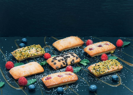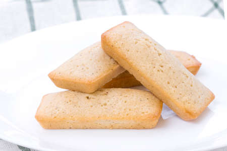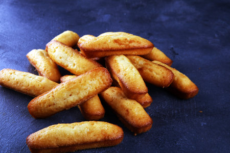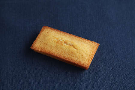French biscuit Financier isolated on navy blue table cloth