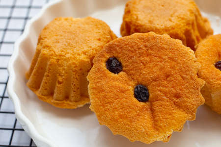 Low calorie gluten and lactose free cornmeal muffins with raisins and fructose sprinkle on a white plate. Healthy vegetarian desserts, dairy free. Home-made snack. Close-up