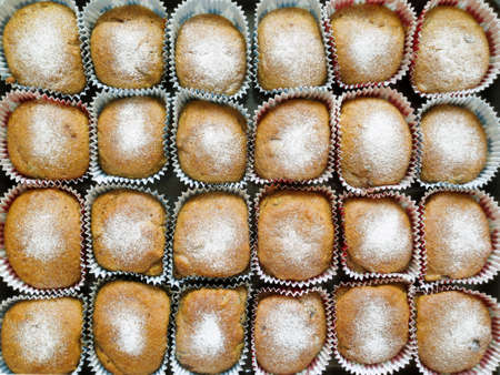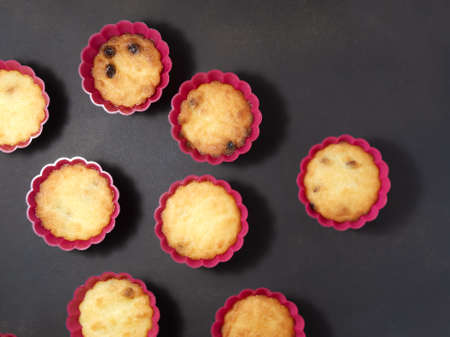 Closeup of homemade vanilla muffins places in rows on black background. Healthy snack.