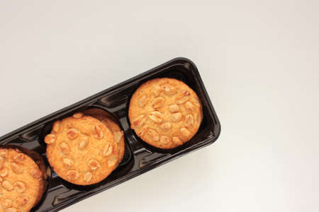 Peanut cookies in a box. Biscuits pack on white background. Overhead view, copy space