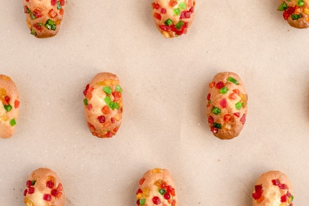 Cupcakes with candied fruits on a paper surface in a row