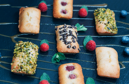 Delicious Financiers adorned with Fresh Berries presented on an Elegant Marble Surface