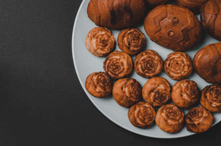 Mafins on a dark wooden background with flowers. Homemade baking. Mini apple charlottes.