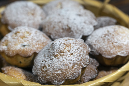 Cupcakes in a basket with powdered sugar. Selective focus.
