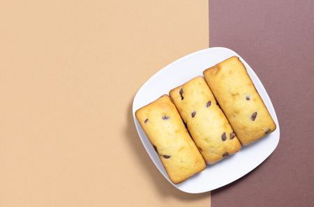 Sweet cake bars with chocolate chips in plate on two-tone background, top view with copy space