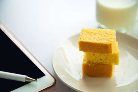 Close up a butter cake pack in a white plate next to a tablet device with a cup of milk blurred background in the morning.