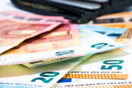 Pile of various kinds euro banknotes on desk with black leather wallet use for money or currency background and financial concepts.