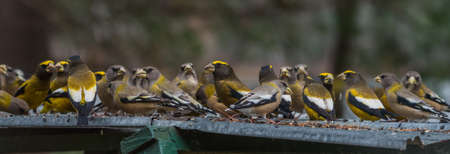 Yellow, black & white colored, Evening Grosbeaks (Coccothraustes vespertinus) on a deck having seed lunch, colourful heavyset finch adds a splash of yellow in winter snow.
