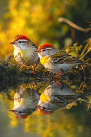 sparrow staring at its reflection in a puddle after the rain, created with generative ai