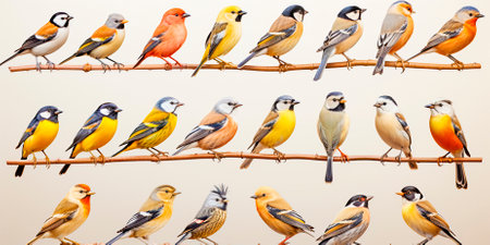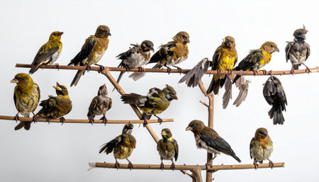 A diverse assembly of various bird species gathers on interconnected branches, creating a visual representation of community, society, and communication. Set against a clean white background, this collection highlights the beauty and variety within the avian world, perfect for concepts of teamwork, networking, and natural order.