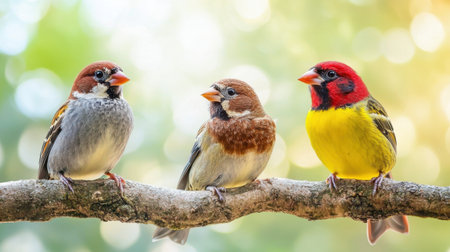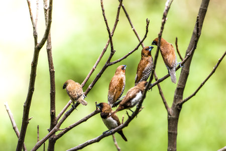 A group of birds of the type Estrildidae sparrow or estrildid finches perched on a bamboo branch in a sunny morning, a background of blurred green leaves in nature