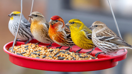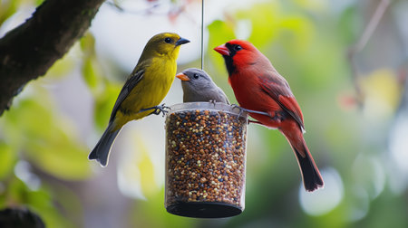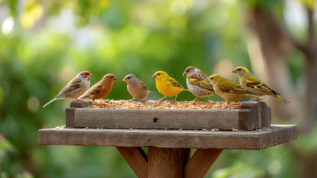 Colorful birds feeding together at a garden feeder surrounded by lush greenery during a sunny afternoon