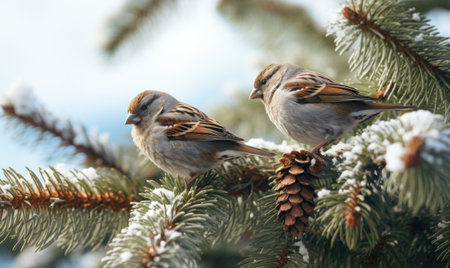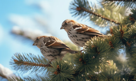 sparrows sitting on the spruce branch