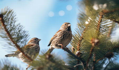 Sparrows sitting on a branch of a pine in the spring