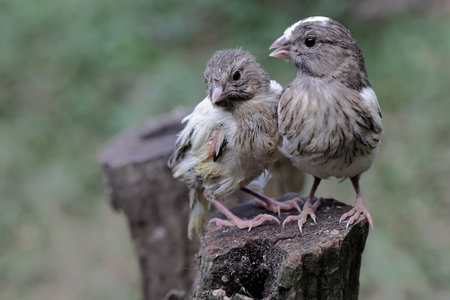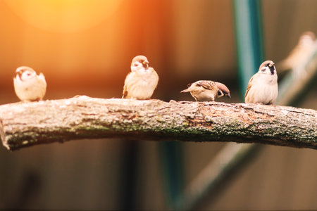 beautiful natural background with little funny Chicks Sparrow birds sitting on a branch in Sunny summer garden