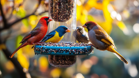 Northern cardinal, varied bunting, and house sparrows eating seeds from a bird feeder in autumn