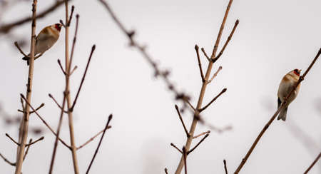 Two Goldfinches in a bare tree which is covered in buds in the winter.
