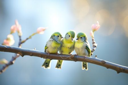 trio of parakeets on a sunlit branch