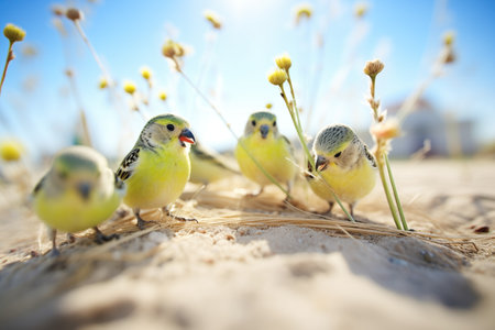 group of budgerigars feeding on scattered seeds