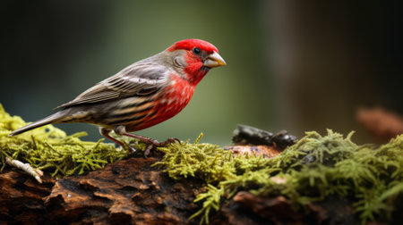 a small red bird perches on a patch of moss, showcasing its vibrant colors against the soft gray tones. this accurately depicted bird specimen captures the essence of emotion through precise lighting techniques. the swirling vortexes add a touch of artistic flair to this precisionist composition. ai generated