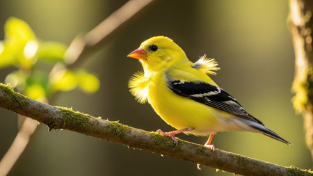 A small yellow bird with black and white markings perches on a moss-covered branch. The image features a shallow depth of field, with a blurred green background. Warm sunlight illuminates the subject, highlighting its bright plumage. This image is suitable for various commercial uses, including nature-related content.