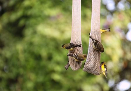 Pine Siskin finches (Carduelis pinus) in spring competing for space and food at a feeder. Aerobatic displays and territorial squabbling at a feeder in a northern Ontario woods.