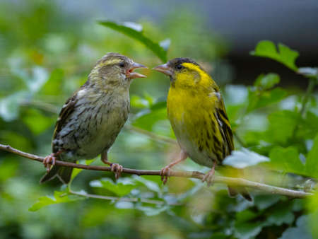 The Eurasian siskin (Spinus spinus) birds female and male