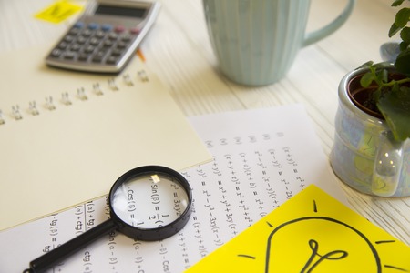 Doing Math tasks with formulas, magnifying glass, an opened notebook, a coffee mug and a calculator on paper background