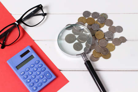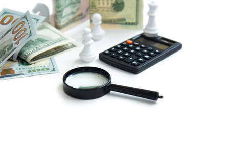 Magnifier, calculator, paper money and white chess isolated on white background. Concept of keeping money, investing