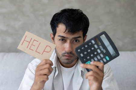 Stressed and headache asian man with large bills or invoices no money to pay to expenses and credit card debt. Financial problems, mortgage, loan
