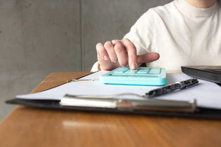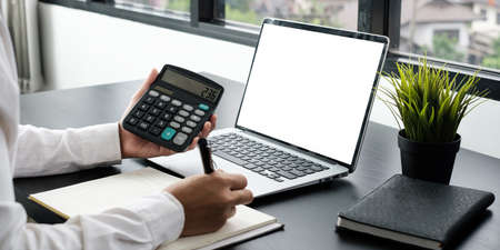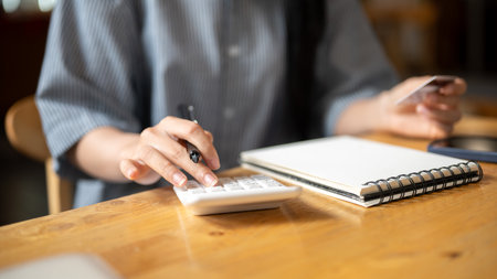 Close up Businesswoman using calculator and laptop for do math finance on wooden desk in office and business working background, tax, accounting, statistics and analytic research concept