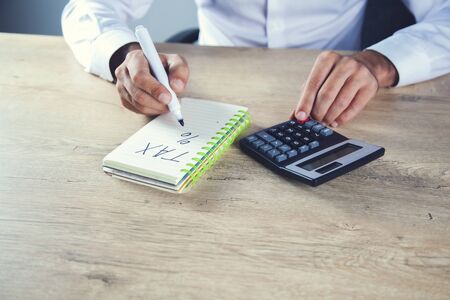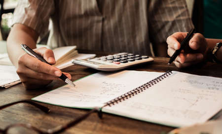 Man hand holding pen and calculator expense or tax receipt. business finance concept.