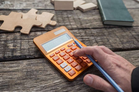 Hand of a student or accountant using calculator holding a pen on his wooden desk with puzzle pieces and pegs and green note pad on the desk.
