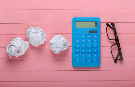 Calculator with crumpled paper balls, glasses on a pink wooden background. Top view