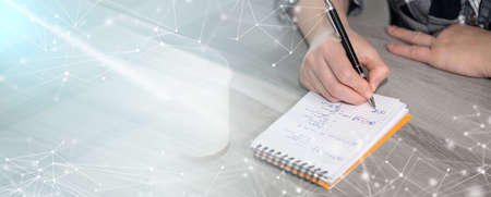 Close-up of a man's hand doing calculations on a calculator. The index finger presses the multiply button. Open spring-loaded notebook and pencil lying side by side on gray surface. selective focus.