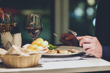 Hands of man eating fine haute cuisine dish at table in restaurant