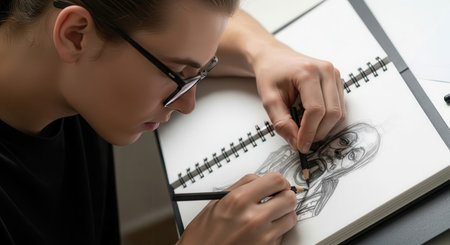 Young man with glasses concentrates on sketching a detailed figure in a spiral notebook, highlighting creativity, precision, and artistic process.