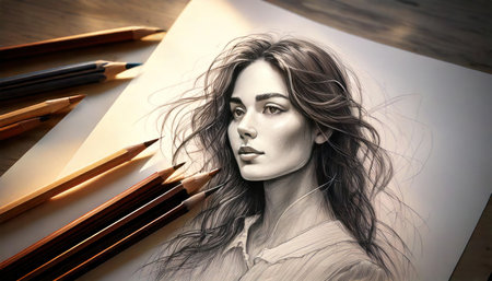 Drawing portrait of beautiful young woman with long hair on wooden table