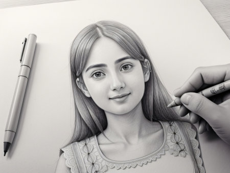 Close-up portrait of a beautiful girl with a pencil on the drawing.