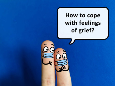 Two fingers are decorated as two person wearing mask during pandemic. One of them is asking how to cope with feelings of grief.