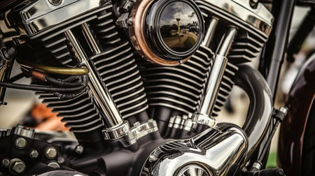 Closeup of chromed motorcycle engine. Generative AI