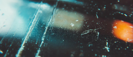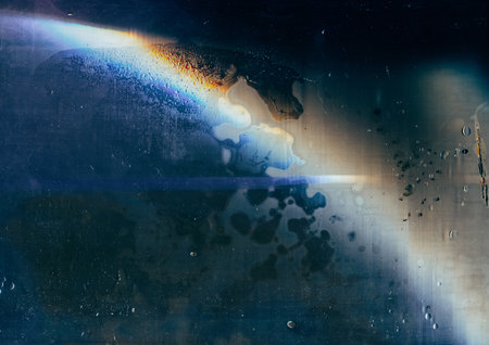 Weathered glass. Dust scratches. Old film overlay. Orange blue rainbow flare noise dirt stains water drops on dark wet aged window texture abstract illustration background.