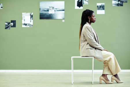 Side view of stylish young Black woman sitting on stool in modern art gallery looking at black and white photos on green wall