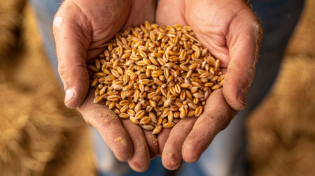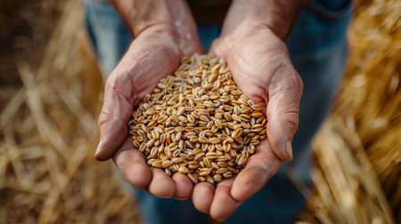 Detailed close-up of golden wheat grains in a farmer's hands, highlighting the natural beauty and the farmer's connection to their crop.